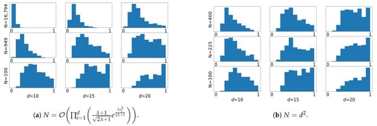 We can see from Figure 1a that is not a fast enough growth of N to avoid weight collapse: the histograms skew to the right along the bottom-left to top-right diagonal, suggesting that weight collapse (i.e., one weight dominating the rest, and therefore the variance of the weights being large) is bound to occur in the joint limit with . In contrast, the histograms in Figure 1b skew to the left along the same diagonal, suggesting that the probability of weight collapse is significantly reduced if . We observe a similar behavior with other choices of dimension d by conducting experiments with sample sizes and , and we include the histograms with in Appendix C. Our next result shows that these empirical findings are in agreement with the scaling of the -divergence between target and proposal in the small noise limit.
