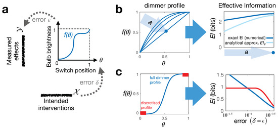 Illustrating continuous Effective Information (EI) on a simple toy system. (a) shows the system construction: a dimmer switch with a particular “dimmer profile” . We can intervene on it by setting the switch up to error tolerance , while effects are similarly measured with error ; (b) shows that for uniform errors , out of the family of dimmer profiles parametrized by a (left), the linear profile gives the “best control,” i.e., has the highest EI (where dark blue—numerical EI calculation and light blue—approximation in Equation (4)); (c) illustrates how for two other dimmer profiles (left), increasing error tolerances influence the EI (right, calculated numerically). The profile in red represents a discrete binary switch—which emerges if we restrict the interventions on the blue dimmer profile to only use “ends of run.” Crucially, such coarse-graining allows for an improved control of the light (higher EI) when errors are sufficiently large.