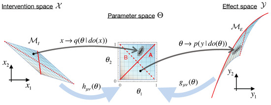where summation over repeated indices is implied. This defines the Fisher information metric with . This introduces a distance metric on the parameter space , turning it into a Riemannian manifold, which we term the “effect manifold” (this is usually called simply the “model manifold” in the literature, but here, we want to distinguish it from the “intervention manifold,” introduced below). More precisely, it is usually defined as —the collection of all the effect distributions, or the image of the parameter space under the model mapping, with Equation (5) being the natural distance metric on this space [6,10,14].