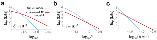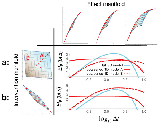 The crossover seen in Figure 3 thus illustrates causal emergence: for larger error values, the coarse-grained 1D description turns out to be more informative than the full 2D model. Since this coarse-graining corresponds to the case where the two bacterial species are seen as identical , we can say that at large errors, our bacterial colony is better modeled as a single homogeneous population. Crucially, this arises not from any change in system behavior, but merely from how we interact with it: either from what interventions we impart or from which effects we measure. Note also that when both the intervention and effect errors are scaled together , we see analytically from Equation (8) that is constant, and so: