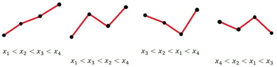 Ordinal pattern examples for . The figures represent discrete data points from a uniformly sampled signal. There are 24 possible patterns for .