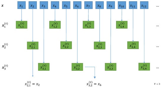 Schematic representation of the composite coarse-graining procedure at : we segment the original signals in nonoverlapping segments of size m; if we shift the initial position, we can build m different coarse signals , , and .