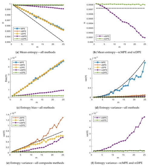 Figure 4d–f show the variance obtained from the PE methods over simulated uncorrelated noise signals. As we can see from Figure 4d, the original MPE presents the highest variance from all the methods, which confirms the need for composite and refined composite MPE instead of the classical algorithm. Moreover, the MPE variance increases quadratically (12), as expected from our previous work [12] for uncorrelated signals. Figure 4e takes the MPE variance out, in order to compare the refined methods. As we can see, cMPE has the highest variance, followed by rcDPE, rcMPE, and rcDPE, in that order. The black dotted line represents the theoretical variance for cMPE and cDPE. We can see here that cDPE actually performs sightly better than expected. Finally, Figure 4f shows only the best performing methods, rcMPE and rcDPE. From Figure 4f, we can see that rcDPE is not only the method with the lowest variance (three orders of magnitude less than the variance of MPE), but the only one which does not increase with scale. Moreover, rcDPE variance runs along the predicted theoretical value from Equation (35). The fact that rcMPE still presents a variance increase with respect to m is explained by the artifact cross-correlations, which we know from Section 3.1.3, are scale-dependent.