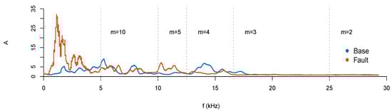 The bearing fault data set [14] consist of signals from a bearing test rig, with a load of 270 lbs, input shaft rate of 25 Hz, and a sampling rate of 97,656 Hz for 6 s ( 585,936). The data set has three signals at baseline conditions (labeled “base”), and three signals with outer race fault conditions (labeled “fault”). A further explanation of the data set is available at [14]. Some example periodograms are shown in Figure 5.