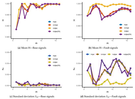 We observe in Figure 6a,b the average entropy values for base and fault signals, respectively, for dimension . The base signals present lower entropy values at , which suggest more regular behavior than the fault signals. As we increase time scale, base signals quickly approach maximum entropy, while the fault signals still preserve some long-range regularities. The notable exception to this is the unfiltered rcDPE method, which presents a similar high entropy for both base and fault signals, at almost all time scales used. Figure 6c,d show the standard deviation measured from the base and fault signals. Here, we do not observe scale-dependent effects on the entropy measured, since the sample size 585,000 is high compared to the dimensions used (). We observe the base signals to have a significant lower variation than the fault set, which is to be expected from bearings in optimal conditions. We can also observe, in particular from Figure 6d, that the unfiltered rcDPE shows the least variation among all methods. The filtered rcDPE, on the other hand, presents a similar curve as the MPE and rcMPE methods, both in the mean entropy and its standard deviation. This strongly suggest that the structures we observe from MPE, rcMPE, and filtered rcDPE are sensitive to the frequency content. Moreover, the fact that the unfiltered rcDPE leads to relatively uniform entropy readings does not come from randomness, but from aliasing. Even though the unfiltered rcDPE has the lowest overall standard deviation, the entropy values themselves are unexpectedly high due to effects not related to the statistical properties of the problem. Therefore, proper filtering is necessary for multiscale entropy analysis.
