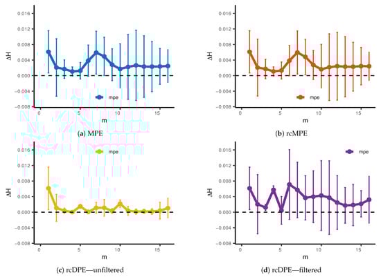 Difference between Base and Fault mean entropy ΔH for (a) MPE, (b) rcMPE, (c) rcDPE unfilteredand (d) rcDPE filtered. Error bars are computed using SΔH = ±1.96, assuming a normal distribution with α = 0.05 significance level.