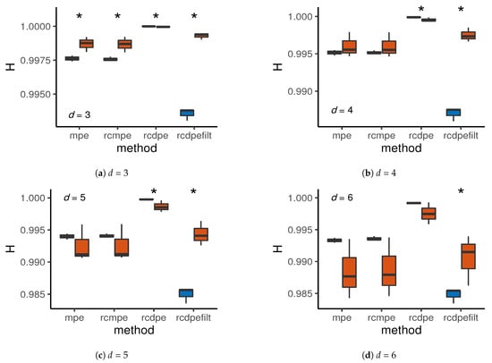 The presence of heavy interaction effects render the interpretation difficult, but we can still comment on the overall effects using Figure 8. Here we can first observe that dimension is the most suited for the classification of this particular data set, since all the entropy measurements are different, statistically speaking. As we increase in dimension, only the rcDPE methods remain significant. At , only the filtered rcDPE method still present significantly differences in entropy between base and fault signals. Figure 8 also shows that filtered rcDPE has a notoriously higher difference between mean entropy than the other methods. This fact implies a better classification power using this technique.