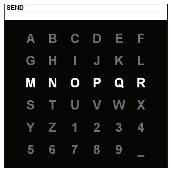 Data set II of BCI competition III which is widely used as a benchmark data set for P300 detection is used as the test data set. The P300 speller paradigm of data set II was described in Reference [26]. It was based on the principle that flashing characters on the screen that subjects focus on will stimulate the presence of P300. The stimulation graphical user interface consists a matrix, including 36 characters, as shown in Figure 2. Subjects are asked to focus on one character given in a prompter on top of the matrix. Every row and every column of the matrix flash once at the rate of 5.7 Hz randomly in each epoch. There are 2 of 12 intensifications that contain the target character at the intersection of the row and the column. Therefore, the target character can be detected by distinguishing P300 and non-P300 signals of every flashing. In other words, the classification of 36 classes is transformed into binary classification problem. 30 P300 and 150 non-P300 signals are obtained after repeating 15 times for each character. There are 85 characters in the training set and 100 characters in the test set of subject A and subject B.