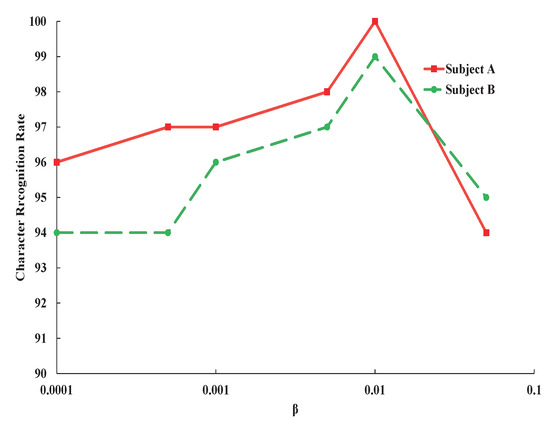 Variation of character recognition rate of subject A and subject B with the changing of variational information bottleneck (VIB) regularization term.