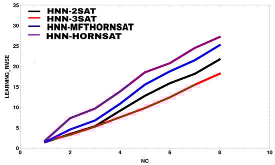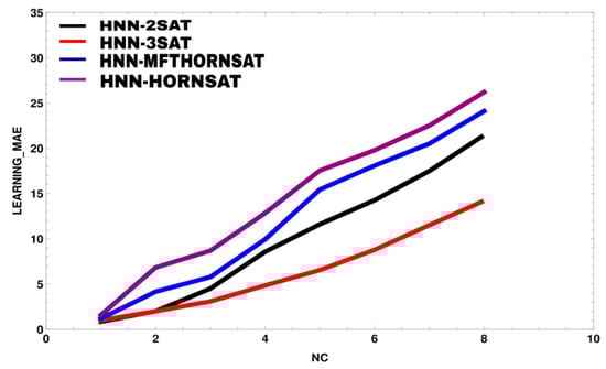 kSATRA for both HNN-2SAT and HNN-3SAT trapped in trial and error solution that leads to RMSE and MAE accumulation. In contrast, the learning phase in HNN-HORNSAT and HNN-MFTHORNSAT were computationally expensive as more iterations needed leading to higher RMSE and MAE values compared to HNN-2SAT and HNN-3SAT. All in all, E