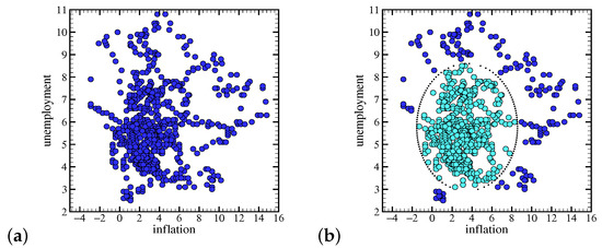 Unemployment vs. inflation. Each point represents the unemployment vs. inflation rate. The inflation rate is the year-on-year consumer price index (CPI) reported monthly for the period ranging from January 1948 till October 2018; (a) All data points, 850. (b) Regular events (greenish blue points, 702 points) and the rare events (dark blue, 148 points) via an ellipse. The center of this ellipse has to coordinate the mean value of each data. Each chord of the ellipse in whatever direction is three times the standard deviation of the data in that direction. This means that points outside the ellipse are three standard deviations away from the mean value. Source: U.S. Inflation Calculator [] and Bureau of Labor Statistics [].