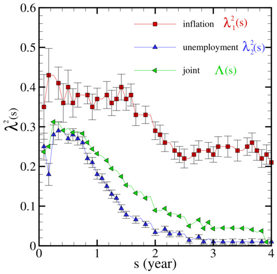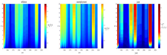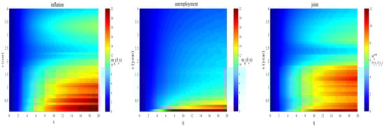 In Figure 3, color intensity plots of high q value moments are depicted for different time scales s, for inflation or unemployment cases, i.e., , from Equation (5), as well as for the joint distribution. It can be seen that the high moments of the unemployment rates find their largest values for scales below six months. Beyond six months, the moments drop rapidly. In contrast to the unemployment case, the value variation of high moments for the inflation rates is relatively noticeable for all scales.