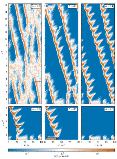 Spatiotemporal representation of the turbulence activity in the computational pipe domain based on the cross-sectional average of the streamwise vorticity () plotted on a logarithmic scale and in a co-moving reference frame. Steady (, a) and pulsatile (b–f) pipe flow at , , and different amplitudes A. Initial conditions for all were either taken from the steady case at time (b–d,f) or composed of a localised helical perturbation on top of the laminar Sexl–Womersley velocity profile (e).