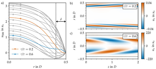 In this case, two more control parameters come in to play in addition to the Reynolds number. The Womersley number () quantifies the relative magnitude of the viscous time scale with respect to the time scale of the imposed flow pulsation, i.e., the oscillation period T. The amplitude () is the relative strength of the oscillating component of the flow () with respect to the steady component of the flow (). For , the statistically steady case is recovered, whereas for large A, the purely oscillatory flow is approached (as the steady part becomes negligible). According to Sexl [13] and Womersley [14], there is an analytical solution to the Navier–Stokes equations for laminar flow through a smooth pipe and single harmonic driving. The Sexl–Womersley (SW) velocity profile () can be added to the (parabolic) Hagen–Poiseuille profile to obtain an analytical (laminar) solution for any combination of and A. As an example, we show in Figure 3a the temporal evolution of for a pulsatile pipe flow at and .