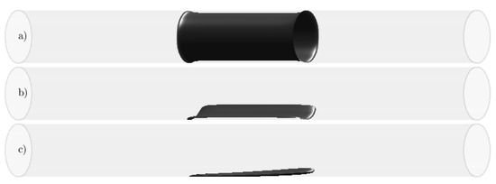 Due to the big parametric space in hand, we designed three simple body force set-ups and left further optimisation of parameters as future work. The first set-up is an axisymmetric force that models the effect of a small circumferential contraction similar to weak stenosis in blood vessels [25] or imperfect pipe joints in laboratory experiments [17] (see Figure 4a). The second set-up is a highly localised force that approximates the effect of a single bump or an individual roughness element (see Figure 4b). The third set-up is also a highly localised force that approximates the effect of a single bump or an individual roughness element, but this time, it is tilted with respect to the axial direction (see Figure 4c). The parameters defining the perturbations are given in Table 1. We studied the effect of the axisymmetric force on steady laminar Hagen–Poiseuille flow at to select a suitable value of the force amplitude . Our criterion was that the force must be strong enough to sufficiently disturb the flow without creating too long of a re-circulation region. For , we found a fair compromise between these two constraints.