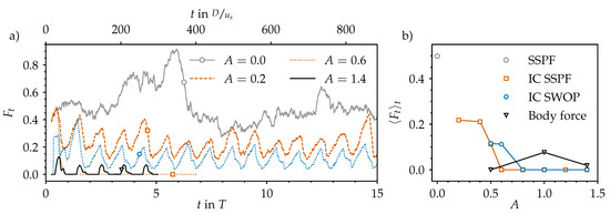Turbulent fraction () in the computational pipe domain based on the axial vorticity data shown in Figure 2 and Figure 7. The threshold to distinguish turbulent from laminar regions is set to . (a) Time series of the turbulent fraction for several amplitudes A (line styles) and different numerical set-ups (symbols and colours from those in (b)). (b) Time-averaged turbulent fraction for four different set-ups: The statistically steady pipe flow (SSPF) serves as reference data and as initial condition (IC) for the first set-up. The IC for the second set-up are composed out of the analytical Sexl–Womersley (SW) velocity profile superimposed with an optimal perturbation (OP). The third set-up is initialised with an unperturbed SW flow and then permanently perturbed using a localised body force (see Section 3.6).