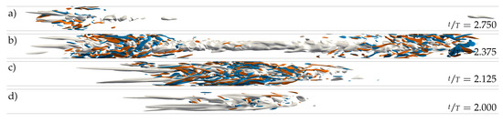 Already at , the time scale of the flow modulation () dominates the dynamics (Figure 2b). In general, as the amplitude of the pulsation increases, the turbulent fraction in the flow decreases, as seen in Figure 5b. Many structures in the initial flow field decay quickly and do not survive the first acceleration (AC) phase. At , only two puffs survive after , and the dynamics appear to reach an equilibrium state that repeats cyclically. The two surviving puffs grow in intensity and in length during the early deceleration (DC) phase of the flow, and they split into two in the late stages of DC before the minimum flow rate is reached. Out of these two, only the upstream puff survives the entire AC phase and reaches the peak flow rate, where this cycle starts over. Indeed, it is well known that for SSPF, only the upstream puff survives in puff interactions [26]. Overall, it appears that for , the flow is clearly self-sustained (above the critical point) and that a successful splitting event may occur at later times. However, the length of the computational domain () may not be sufficient to accommodate three puffs without strong interactions due to the periodic boundary conditions. Similar results were obtained for and and are shown in Figure 2c,d; the question of whether, in these cases, the puffs will ultimately decay or successfully split would require substantially longer runs than those performed here and is not further pursued. Figure 6 shows typical localised structures at four equispaced points of the cycle for , illustrating the cyclically occurring splitting attempts. In agreement with Xu et al. [15], Xu and Avila [16], these figures show that the surviving puffs (Figure 6d,c) are very similar to the puffs in the steady case (Figure 1c) even at this relatively large pulsation amplitude. For , no turbulent structure survived the first pulsation period, and the flow fully relaminarised. We checked amplitudes up to (see Figure 5b). In general, with increasing amplitude, the downstream puff separates farther away from the upstream puff during AC before it dies at almost the end of AC.