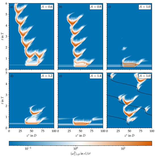Spatiotemporal representation of the turbulence activity in the pipe domain based on the cross-sectional average of the streamwise vorticity () plotted on a logarithmic scale and in a co-moving reference frame (). For pulsatile pipe flow at (, ). (a–e) For different pulsation amplitudes A, always using the SWOP initial condition. Note that the optimal time of perturbation slightly changes with A. The horizontal straight lines mark regions for which three-dimensional representations of the localised flow structures are shown in Figure 8. (f) For a permanent body force and the unperturbed SW velocity profile as initial condition. The curved black line represents the fixed location of the highly localised body force viewed from the co-moving reference frame. The direction of the mean bulk flow () is always from left to right.