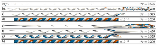 Using a localised helix as initial condition instead also led to a very similar fate for the helix, but only for (see Figure 5b). The amplification of the local helix and its subsequent death is shown in Figure 7c–e and Figure 8a–d. For smaller amplitudes (), intermittent puff turbulence emerged after the growth and decay of the initial helix and then was sustained for many periods (see Figure 5). The dynamics of the generated localised puffs are the same as described in Section 3.1 and are exemplarily shown in Figure 8e–h. The puffs that survive AC grow during early DC and attempt to split into two puffs during late DC. In the subsequent AC, the splitting downstream puff decays and leaves only the upstream puff behind to start the cycle over. Figure 2e and Figure 7a,b compare this cycle and its initialisation phase for different amplitudes. For , a self-sustaining puff develops only from the downstream end of the amplified helix. For , puffs develop from both ends of the localised helix. Shortly thereafter, both puffs interact, which leads to the death of the downstream puff (similar to what happens, for example, in Figure 2b). For , a puff develops only from the upstream end of the amplified helix. For this case, the puff is able to survive for four periods before the flow completely relaminarises.