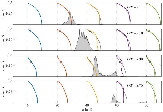 As has been observed in both strategies, whenever a puff tries to split, only the upstream puff survives. This is a feature common to SSPF and is related to the so-called puff recovery length, which represents the influence length the puff has downstream from its position [26,28]. Its effect can be seen in Figure 9, where the instantaneous profile is presented at five axial positions and four time instants for an IC SWOP simulation at , , and . The position of the turbulent puff is presented as a shaded area in terms of axial vorticity. For all phases, the flow quickly recovers the laminar SW profile upstream of the puff location. Downstream of the puff, on the other hand, the flow needs a much longer buffer length to do so. Note the periodic boundary conditions used in our DNS.