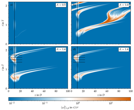 Spatiotemporal representation of the turbulence activity in the pipe domain based on the cross-sectional average of the streamwise vorticity () plotted on a logarithmic scale and in a stationary reference frame. Pulsatile pipe flow at , , and different amplitudes A. Initial conditions are based on the Sexl–Womersley velocity profile, and there is a permanent body force. (a–c) Local bump. (d) Tilted bump.