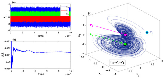 When the parameters values set as , , , Figure 1a–c depicts the time series, largest Lyapunov Exponents, and the phase space of the system (2), respectively. For the numerical simulation of the system (2), we use Matlab 2019a program to plot the time series, the phase spaces, and largest Lyapunov Exponents, in which the standard Runge–Kutta fourth-order scheme was utilized via Matlab to obtain the system solution and then plot the time series and the phase spaces, whereas Wolf algorithm [39] was utilized to calculate the largest Lyapunov Exponent in Matlab. However, it can be seen that the system exhibits chaotic attractor for a long duration time when the starting point is from a neighborhood of the equilibrium point . As all equilibria of the system (2), including , are unstable for , , , the generated chaotic attractor in Figure 1 is self-excited.