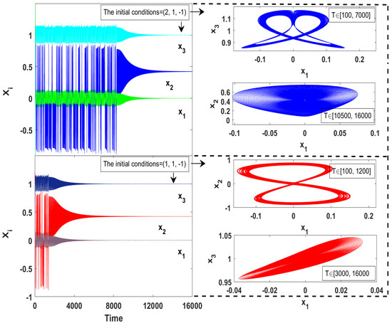 On the other hand, transient chaos usually appears when the initial conditions are chosen near the boundary of the basin of attraction or when the system is very close to a bifurcation point. Thus, by choosing the parameters values as , , , which make the system is close enough to a bifurcation point, we observe that the system (2) exhibits a complex chaotic transient, as shown in Figure 2. In this figure, we have plotted the time series and the corresponding phase portraits for a specific set of the system parameters and with two different sets of initial conditions, which have been chosen near the boundary of the basin of attraction. As can be seen, for each set of the initial conditions, all variables of the system () show a chaotic behavior in short duration time, and subsequently those variables show asymptotic orbit for the rest of the time.