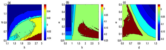 Chaos is usually identified by one of the fundamental algorithms, which is Lyapunov exponent. The Lyapunov exponent is a quantitative measure employed to estimate the divergence or convergence of adjacent trajectories in a system. Here, we calculate the largest Lyapunov exponent when two parameters are varying simultaneously, which can provide a wider vision of the chaotic regions of the system. Therefore, three different sets of system parameters are selected to depict the largest Lyapunov exponent with a step size of 0.02, as shown in Figure 3. Based on this figure, it can be observed that the system (2) exhibits three different behaviors, which can be determined as follows.