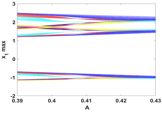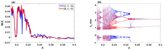 By selecting A as control parameter for the range , the largest Lyapunov exponents and multistable bifurcation diagram of the system (9) are, respectively, plotted in Figure 4a,b when the step size is equal to . By observing such the two figures, the system is simulated with two different initial conditions simultaneously, in which the blue and red orbits begin with the initial conditions and , respectively. Obviously, the system exhibits single chaotic attractors when , and single quasi-periodic attractors when . Meanwhile, the coexistence of two chaotic attractors has appeared when , and the coexistence of two quasi-periodic attractors has occurred when .