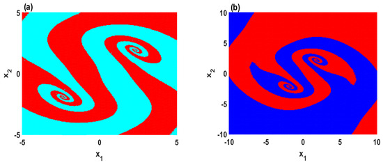 Cross section for of the basins of attraction on – plane with : (a) the coexistence of two chaotic attractors for ; (b) the coexistence of two quasi-periodic attractors for .