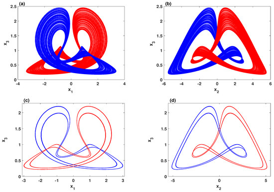 Symmetric coexisting attractors with , , and two sets of initial conditions (blue) and (red): (a,b) the coexistence of two chaotic attractors when ; (c,d) the coexistence of two periodic attractors for .