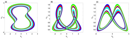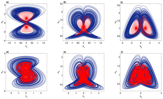 To perceive the effect of decreasing the degree of regularity on the dynamics of the system, Figure 10 plots the phase portraits comparisons with two values of the parameter A. In this figure, the trajectories with lower complexity (red color) are generated by the system (9) for . In other words, these trajectories are the numerical solutions of the system (2), whereas the trajectories with higher complexity (blue color) are generated by system (9) for . Thus, it can be observed that enhancing the complexity of the system (2) could change its nature from order to chaos or even expand its chaotic oscillations to occupy a wider region in the phase space, as shown in Figure 10a–f, respectively.