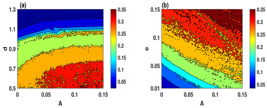 For and Standard Deviation, we depict the complexity analysis results of the system (9) using Matlab 2019a program with two different sets of the system parameters, as shown in Figure 9a,b. There are two parameters simultaneously varying with the step size equal to 0.01, in which one of them is always A. Choosing A as a varying parameter can demonstrate the effect of increasing the power input on the complexity of the system. As can be seen in Figure 9, the complexity of the system is enhanced with the increase of A. In other words, boosting power input to the system can decrease its degree of regularity.