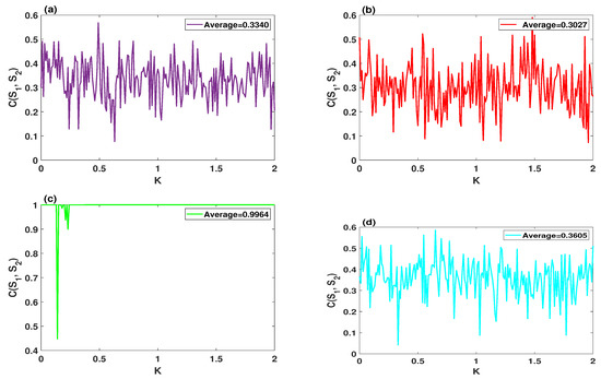 When , , , the sensitivity of systems (2) and (9) is illustrated in Figure 11a,b, respectively. In these two figures, the CCF is calculated between the original time series (), and the modified one () which is created by contaminating one of the initial conditions of the system via a tiny error . Moreover, the sensitivity of the systems (2), and (9) are respectively depicted in Figure 11c,d, where the parameters are set as , , , and . The system (9) has a higher sensitivity to its initial conditions.