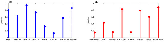The p-values of the binary sequence generated by PRNG of the system (9): (a) Frequency, Block-Frequency, Cumulative Sums (Forward), Cumulative Sums (Reverse), Runs, Longest Run of Ones, Binary Matrix Rank, and Discrete Fourier Transform, respectively; (b) Non-overlapping Template, Overlapping Template, Universal Statistical, Linear Complexity, Approximate Entropy, Serial, Random Excursions, and Random Excursions Variant, respectively.