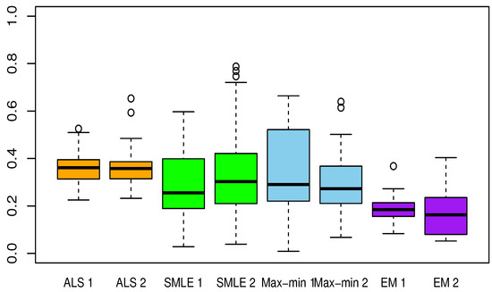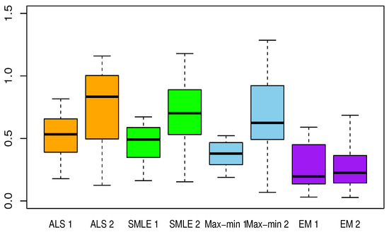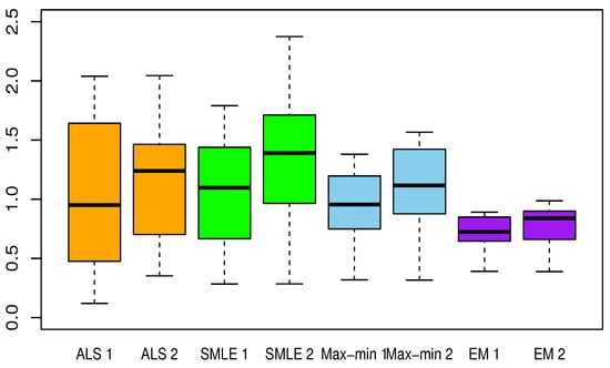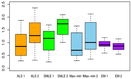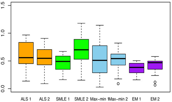Table 2, Table 3, Table 4, Table 5 and Table 6 present the results for each test function. The averaged Euclidean distance from the estimates to the true constants and the RMSEs of the estimates are displayed in each table. The standard deviations are the numbers in parentheses. In terms of the RMSE, the proposed method offered superior results over the ALS, SMLE, and max-min methods. In particular, the EM shows less bias and lower RMSE than the other methods. We have this result again in Figure 1, Figure 2, Figure 3, Figure 4 and Figure 5, which present the boxplots of the distance to the true value for each of the five test functions. In many cases, the medians of the EM estimates were nearer to the true constants than those from the SMLE, ALS, and max-min methods. The box lengths of the EM estimates were shorter than those obtained from the other methods. It is notable that the max-min was more effective than the ALS and SMLE in test functions 2–4. One plausible reason that the EM was superior to the max-min is that the numerical integration for the conditional expectation in the EM may be more stable than the numerical optimization of the ARSS in the max-min.