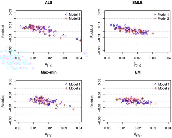 Figure 6 depicts the residuals () plotted according to the predicted values that were obtained by various methods using GP Model 1 and Model 2. The residual plots from all methods exhibited linear trends. The trend for the EM algorithm was the lowest among the methods.