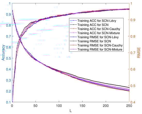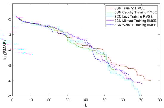 A mixture distribution is derived from a collection of other random variables. First, a random variable is selected by chance from the collection according to given probabilities of selection. Then, the value of the selected random variable is realized. The mixture distribution densities are complicated in terms of simpler densities, which provide a good model for certain data sets. The different subsets of the data can exhibit different characteristics. Therefore, the mixed distributions can effectively characterize the complex distributions of certain real-world datasets. In [], a robust SCN based on the mixture of the Gaussian and Laplace distributions were proposed. Thus, Gaussian and Laplace distributions are mentioned in this section for comparison purpose.