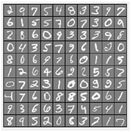 The handwritten digit dataset contains 4000 training examples and 1000 testing examples, a subset of the MNIST handwritten digit dataset. Each image is a 20 by 20 pixels grayscale image of the digit (Figure 6). Each pixel is represented by a number indicating the grayscale intensity at that location. The 20 by 20 grid of pixels is “unrolled” into a 400-dimensional vector.