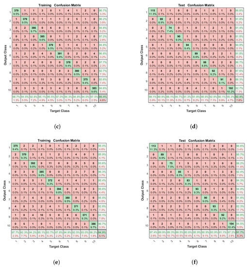 (a) SCN training performance for classification model; (b) SCN test performance for classification model; (c) SCN-Cauchy training performance for classification model; (d) SCN-Cauchy test performance for classification model; (e) SCN-Lévy training performance for classification model; (f) SCN-Lévy test performance for classification model.
