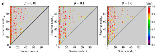 The second term in Equation (6) is the channel capacity in bits for the effective transition matrix. The loss function defined in Equation (6) is a field over all existing pairs of source-receiver combinations in a GRN. By definition, , and if there is no path from .