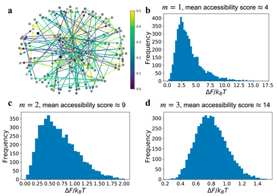 Distribution of relative free energy of networks with different mean accessibility scores and a uniformly distributed edge error field, . (a) The graph shown is one among the 5000 realizations of a random error field on a type Barabási-Albert graph, which has a mean accessibility score . (b–d), show the resulting distributions in relative free energy over 5000 realizations due to the same uniformly distributed error field, but for graphs with different accessibility scores originating from the choice of .