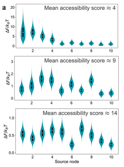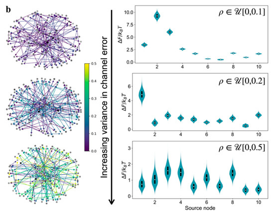 The existence of the order in distributions is a function not only of topology and also of the distribution in the edge communication error values. We demonstrate this in Figure 4b using the distributions for type graphs, but with increasing the range of values of . When the edge error value is uniformly distributed within a more constricted range, , we still observe a strong hierarchy in distributions—the median values for different source nodes are separated beyond the dispersion in the individual distributions. However, this hierarchy is lost upon increasing the extent of variability in to uniformly distributed in [0.0,0.5], the distributions for different source nodes become similar to each other, and the median values decrease for all the source nodes compared to the two narrower distributions in . Thus, increasing variability in edge error values diminishes the possibility of the existence of a small subset of thermodynamic master regulators.