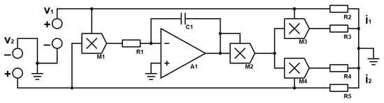 In Figure 2, are input voltages of the model, to multipliers, to resistors, a capacitor, and output currents, respectively. The analytical mathematical model is given as