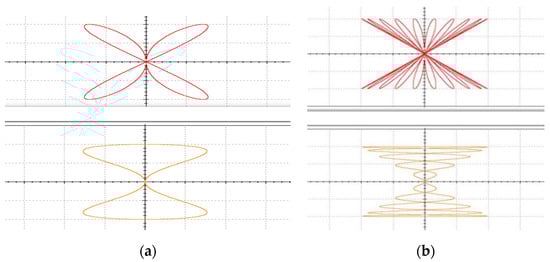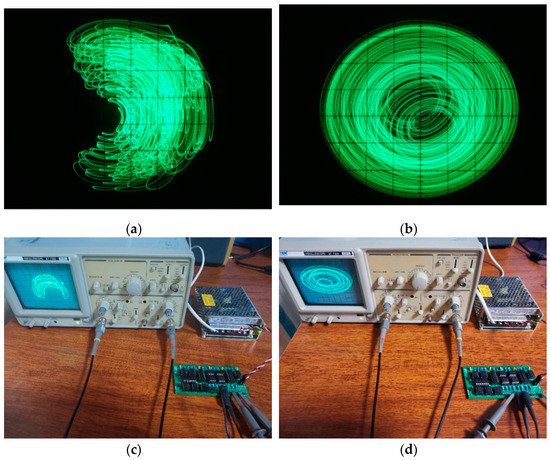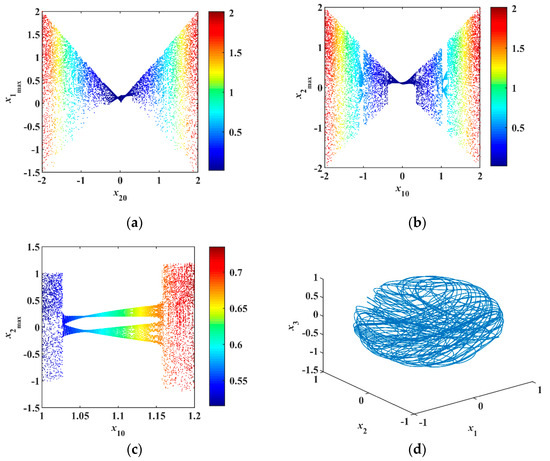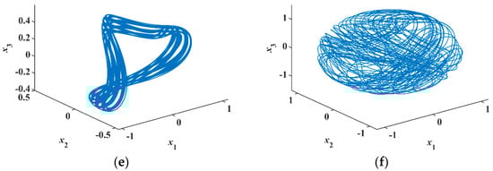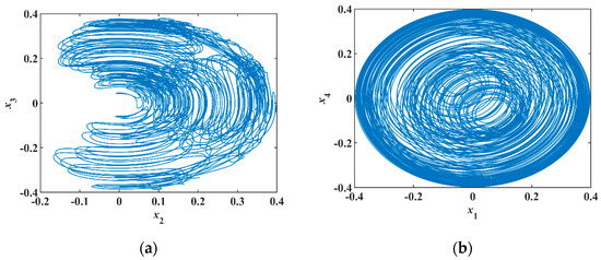 Selecting the initial values and parameters , the phase portraits of numerical simulation are shown in Figure 10a,b. In the analog circuit, the chips have a slight voltage deviation that corresponds to a small initial value, so there is no need to add the initial voltage between the capacitor’s two pins.