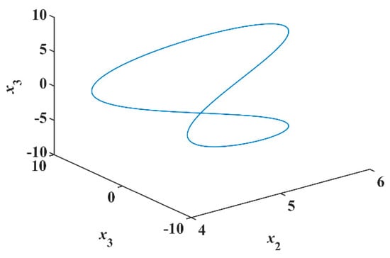 Thus, the system of Equation (8) is a Hamiltonian conservative system. Therefore, it preserves both the phase-volume and Hamiltonian. Using Matlab for numerical simulation, take parameters , initial conditions , and sampling time s. Since the conservation of both phase-volume and Hamiltonian, this system only produces periodic orbit [17,18,19], as shown in Figure 4.