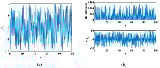Chaotic orbits of system Equation (11), (a) time series of , (b) time series of and Hamiltonian.