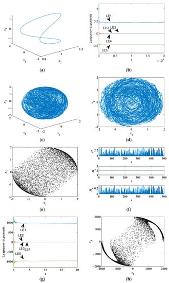 The LEs in Figure 6b, indicating the sum of the LEs is zero. From Ref. [20], the Kaplan-Yorke Lyapunov dimension is