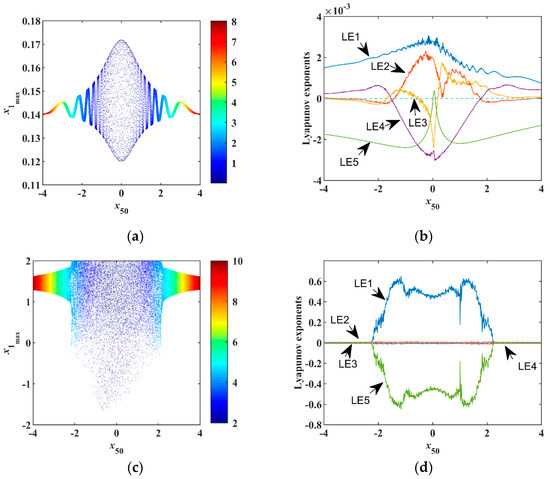 Dynamical analysis with fixed , (a) Bifurcation of with , (b) LEs of with , (c) bifurcation of with , (d) LEs of with .