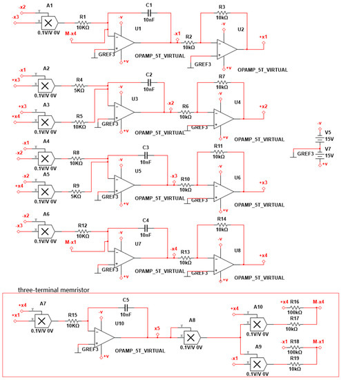 Circuit implementation of system Equation (15), with electronic parameters: